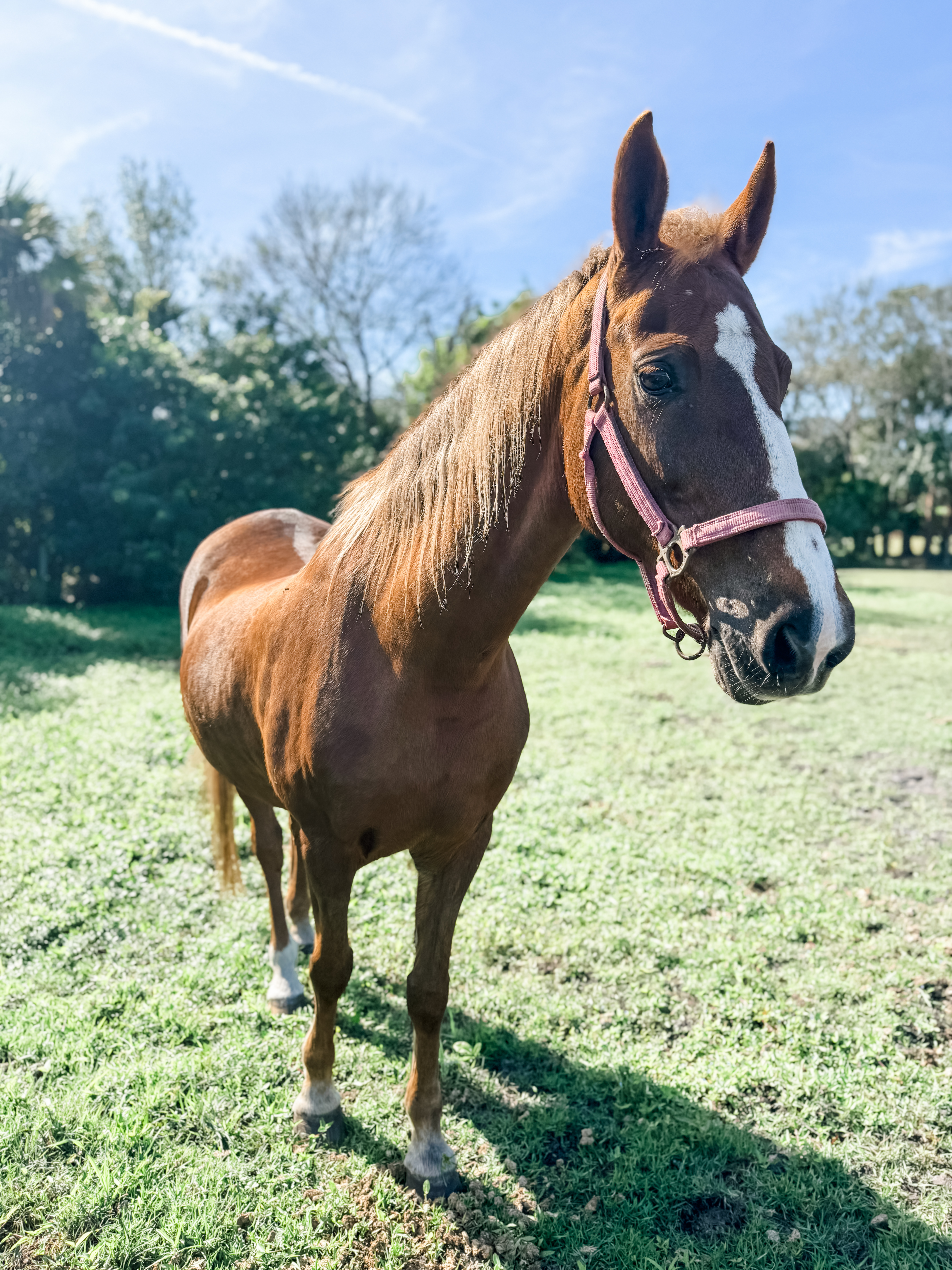 Meet Misty our twenty-year-old Thoroughbred, who adores water, eagerly splashing and playing whenever she can. Her kind nature shines through in her interactions with others, always gentle and considerate. Known for her skill in jumping, Misty excels in agility and grace, making her a favorite in equestrian events.